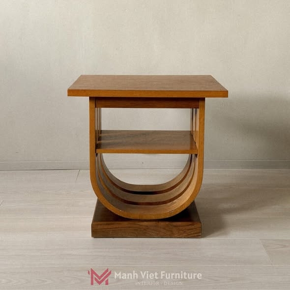 Điểm nổi bật nhất của sản phẩm là cấu trúc chân đế hình chữ U đối xứng, tạo cảm giác vững chắc và độc đáo. Cả mặt bàn phía trên và bệ đỡ dưới cùng đều có hình vuông, tạo cảm giác cân đối và chắc chắn.