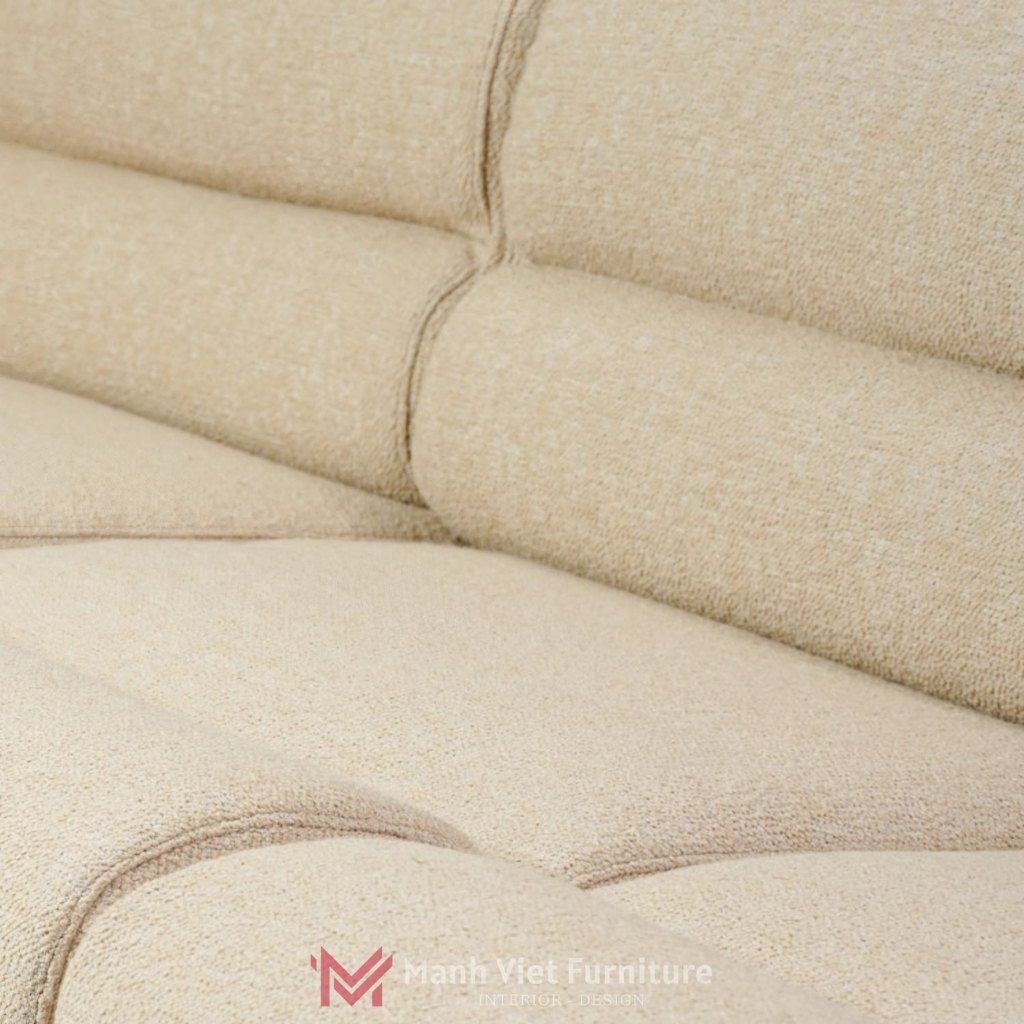 Sự kết hợp giữa tông màu nâu ấm của gỗ và sắc kem tinh khôi từ vải tạo nên một bản giao hưởng màu sắc vừa sang trọng, vừa gần gũi. Điểm đắt giá nhất chính là phần chân đế thấp, tạo hiệu ứng thị giác như chiếc sofa đang "bay" lơ lửng, mang đến cảm giác nhẹ nhàng, thanh thoát cho không gian phòng khách.