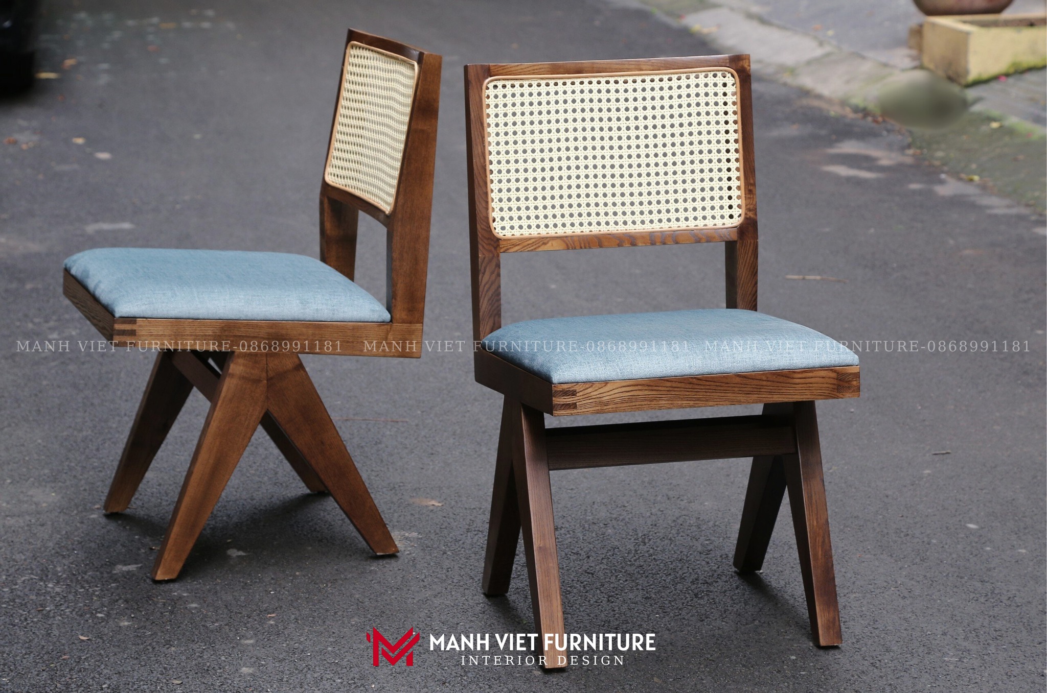 Chất liệu: Gỗ Sồi Mỹ, tựa lưng mây nhựa, mặt ngồi bọc vải nỉ Cỏ May.