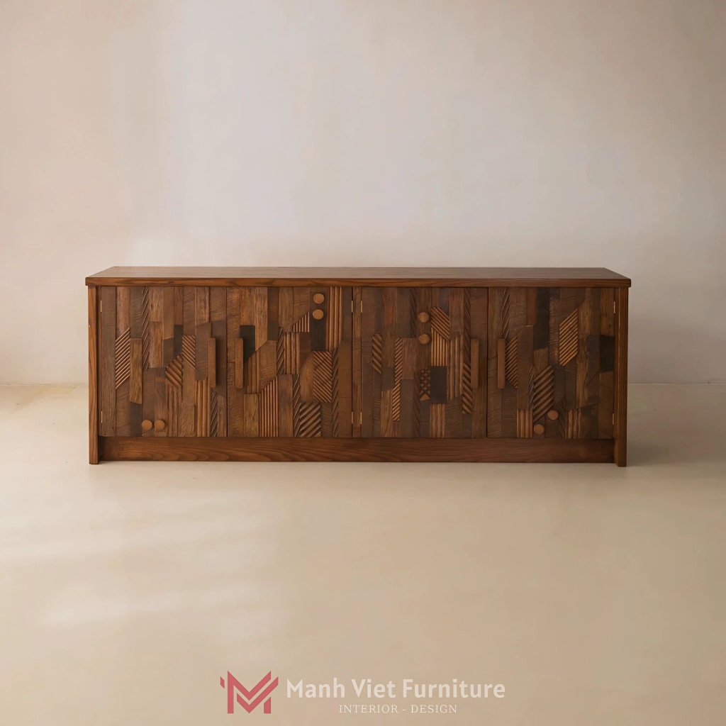 Lấy cảm hứng từ những họa tiết bộ lạc cổ xưa, mỗi đường trạm khắc trên bề mặt sản phẩm là một mảnh ghép của nghệ thuật đương đại trên nền gỗ tự nhiên, kể một câu chuyện về sự tỉ mỉ, nơi những khối hình học gồ ghề tạo nên chiều sâu thị giác đầy mê hoặc.