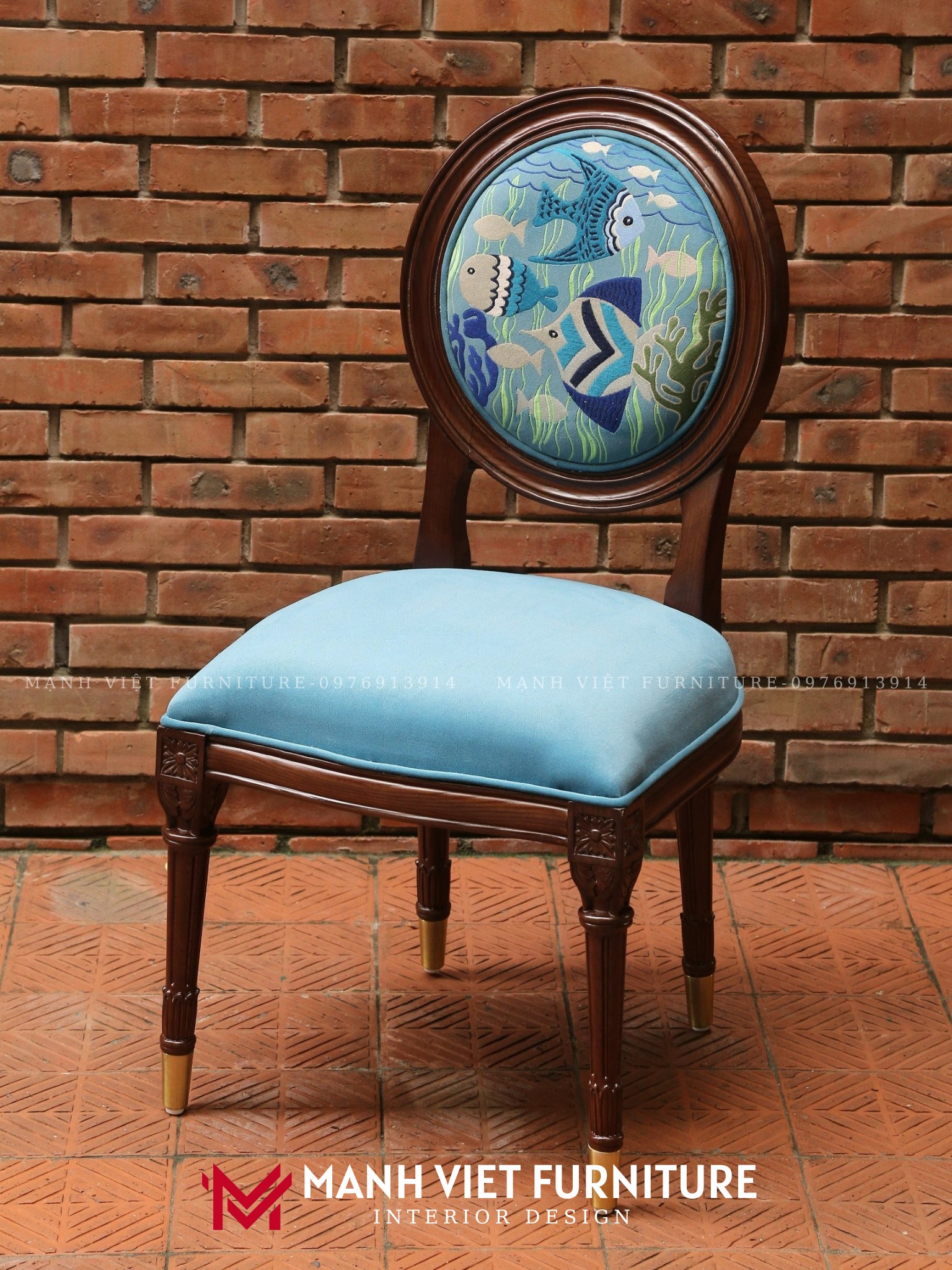 Ghế ăn Louis được thiết kế độc đáo với phần lưng ghế hình tròn, không có tay dựa ở hai bên giúp làm nổi bật những đường cong mềm mại của phần lưng ghế. Chân ghế nhỏ nhắn, được điêu khắc tỉ mỉ, tạo nên cảm giác hài hòa cho mẫu ghế này. Phần đệm bằng da nỉ cao cấp có họa tiết, hoa văn tinh tế cùng với màu sắc trang nhã như vàng, đen, nâu,... mang đến cho chiếc ghế vẻ đẹp hiện đại xen lẫn một chút cổ điển. Những điều này kết hợp lại tạo ra một mẫu ghế Louis tinh tế, sang trọng nhưng không kém phần nổi bật cho căn phòng.