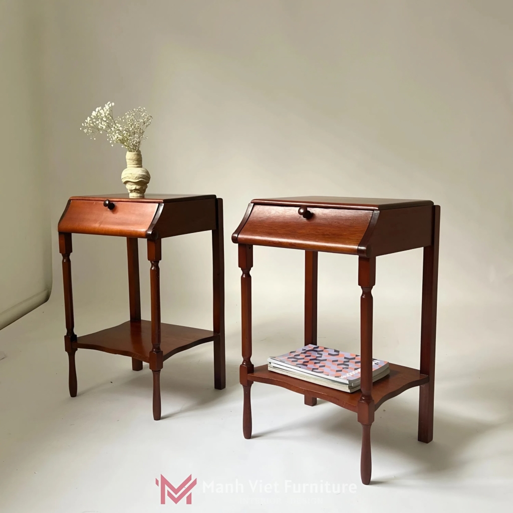Gam màu nâu trầm ấm cùng thiết kế hai tầng tiện dụng, vừa có ngăn kín để lưu trữ riêng tư, vừa có kệ hở để những món đồ decor khác. Một sự kết hợp hoàn hảo giữa công năng và thẩm mỹ, nâng tầm phong cách sống cho chủ nhân yêu thích sự hoài cổ.