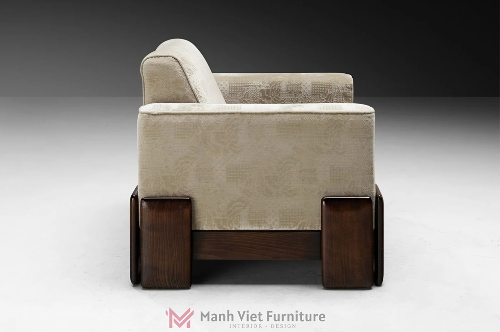 Thiết kế tạo ra sự đối lập thú vị: Sự cứng cáp, góc cạnh của khung gỗ tự nhiên tương phản hoàn toàn với sự mềm mại, êm ái của lớp vải bọc màu kem.